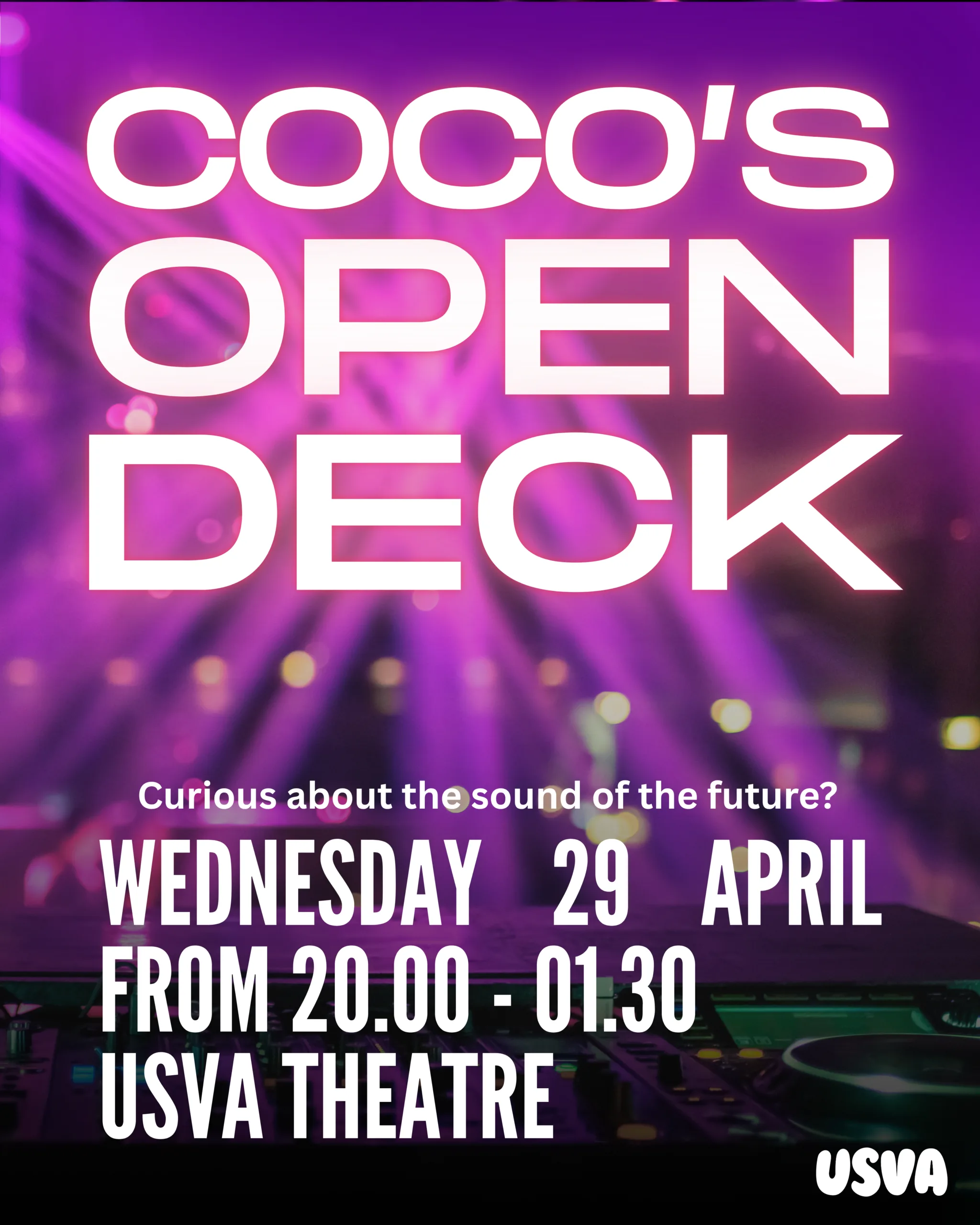 Curious about the sound of the future? Come to Coco’s Open Decks! For one night, we will change USVA’s theatre into a club, and you can bring all of your friends to dance to the music of DJ’s who just started! Everyone will play a set of 20-30 minutes, that means more then 10 different DJ’s! That is pretty short, so the tracks are planned wisely!