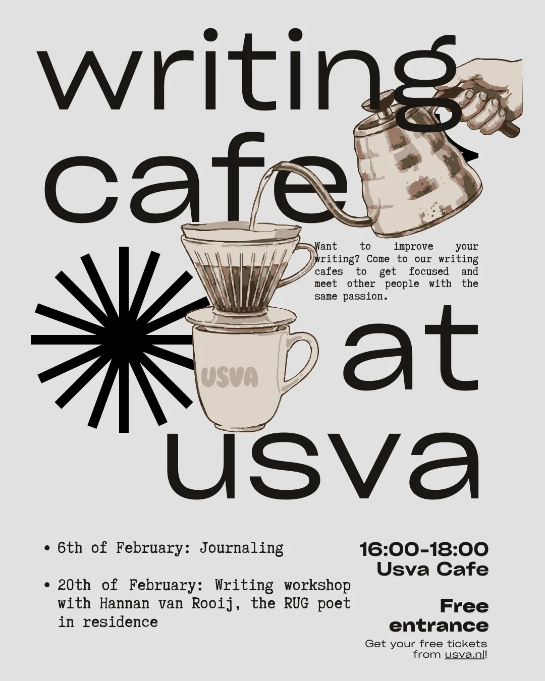 Want to improve your writing? Come to our writing cafes to get focussed and meet other people with the same passion. On the 6th of february we are hosting a chill Journaling cafe where you can focus and share ideas.