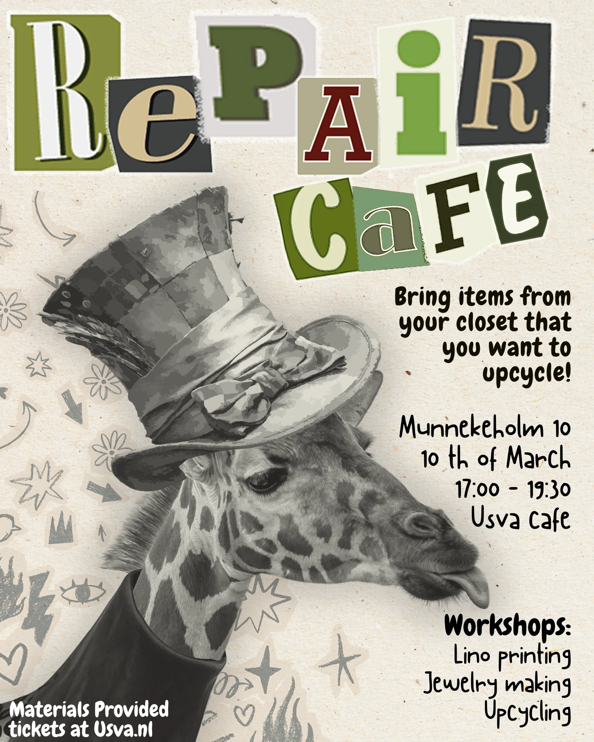 During the repair cafe evening, you can participate in different workshops such as lino printing, jewelry making, and upcycling. Materials are provided, but you are welcome to bring your own. You can get a cup of tea at the bar, relax and chat with other upcycling enthusiasts.